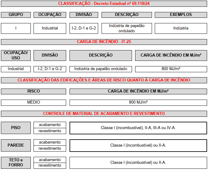 I Indústria I-1 Indústria com carga de incêndio até 300 MJ/m² 3 (três) anos