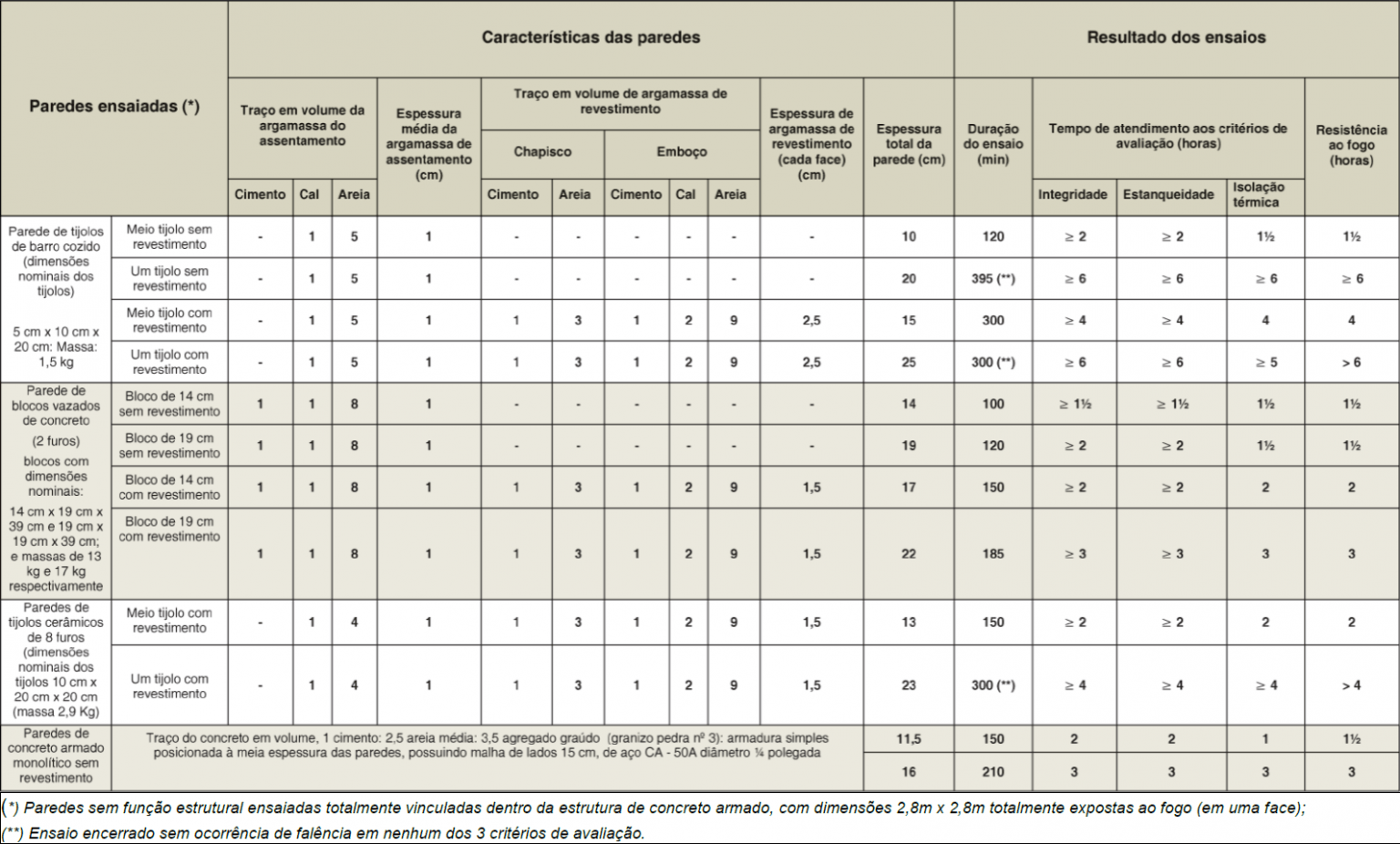 b. atendimento a tabelas elaboradas a partir de resultados obtidos em ensaios de resistência ao fogo;