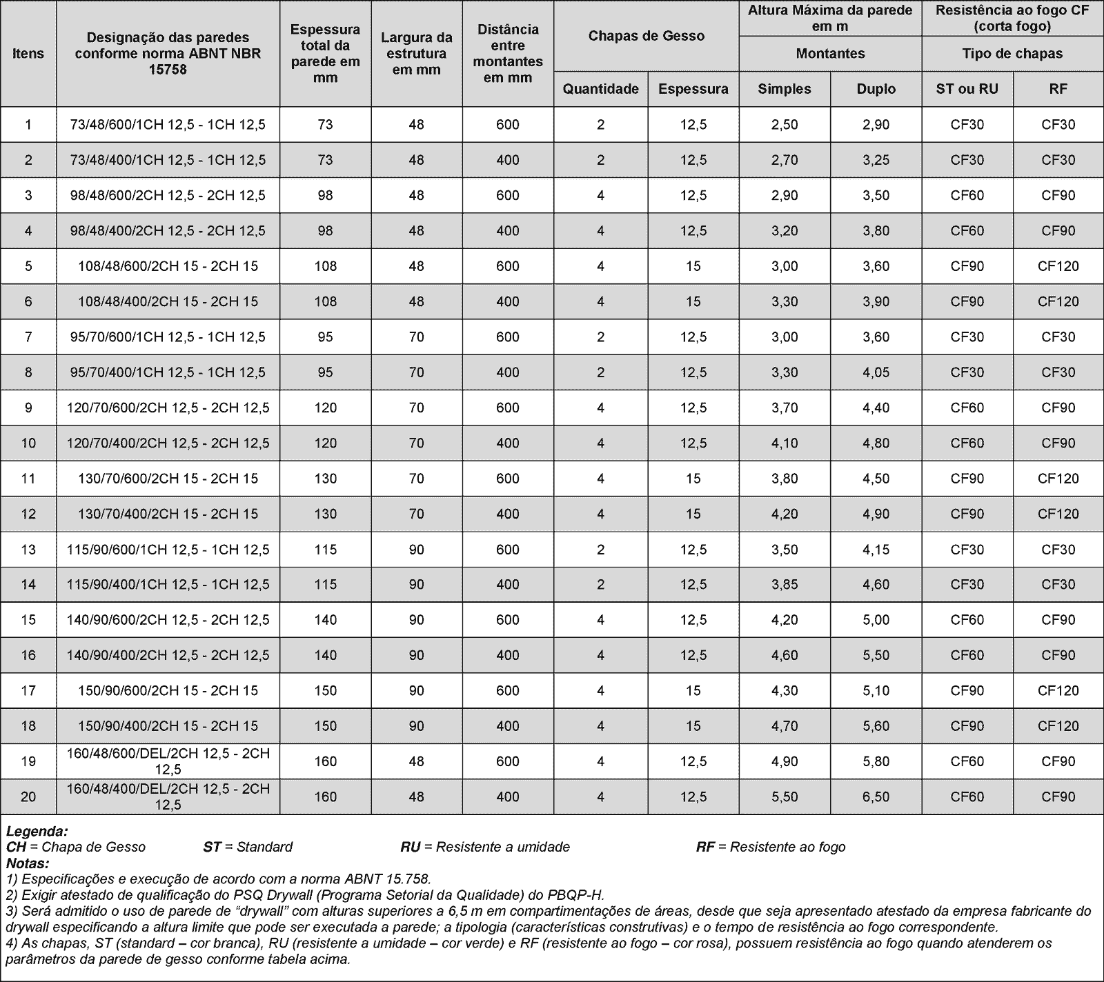 Tabela de resistência ao fogo de paredes em chapas de gesso para drywall