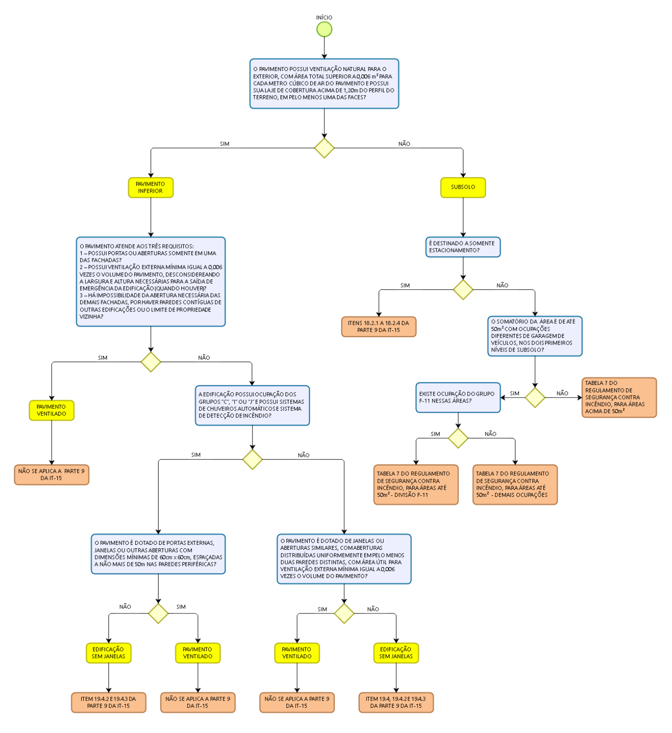 20.1 Como forma de orientar a classificação de um pavimento em subsolo ou pavimento inferior, e a classificação do pavimento inferior como sem janelas ou ventilado, segue em anexo a esta parte da IT um fluxograma para enquadramento destes pavimentos.