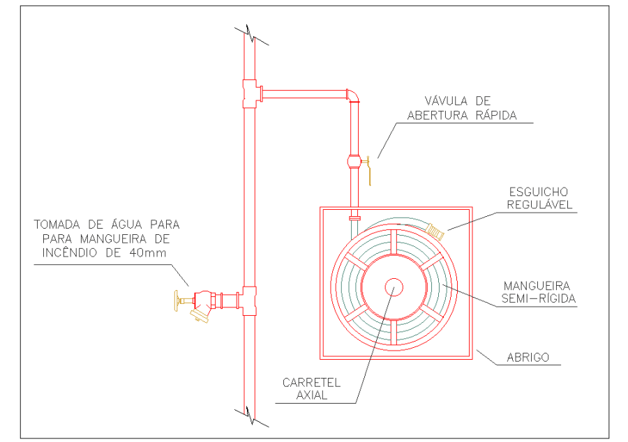 D.4.1 Quando os mangotinhos forem abrigados em caixas de incêndio, estas devem atender às mesmas condições estabelecidas para as caixas de hidrantes, devendo ter as dimensões necessárias para abrigar o carretel axial.