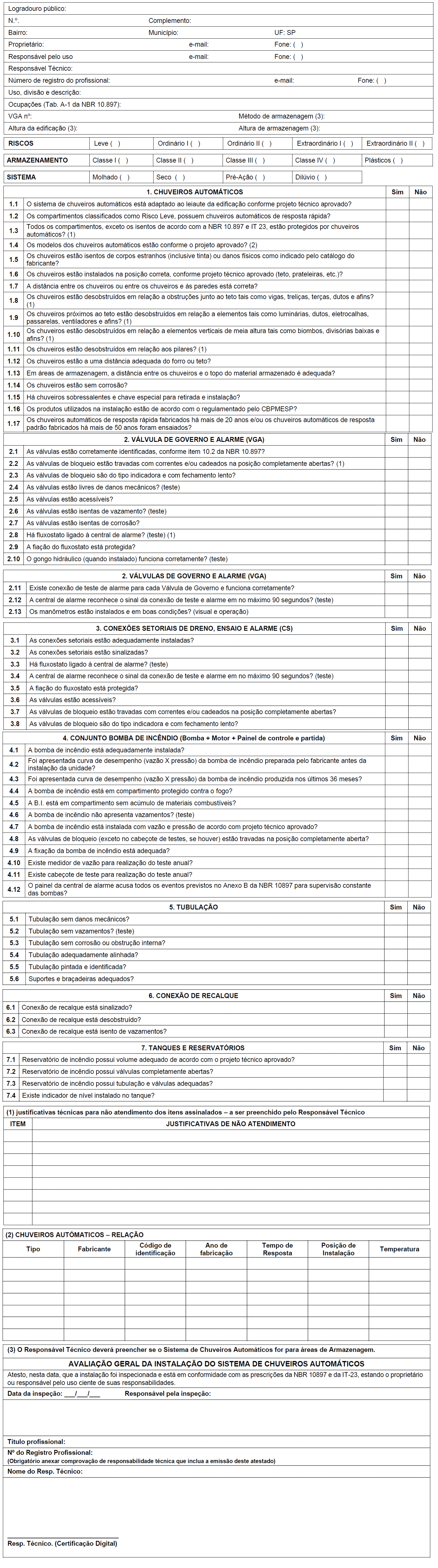 6.2.1 O relatório de inspeção do sistema de chuveiros automáticos é parte integrante do Processo de Segurança Contra Incêndio, devendo ser elaborado por profissional habilitado e ser entregue no ato da vistoria do Corpo de Bombeiros, acompanhado de seu respectivo comprovante de responsabilidade técnica.