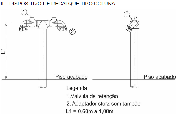 5.13.1 O dispositivo de recalque deve ser duplo e preferencialmente do tipo coluna. Onde houver impossibilidade técnica o dispositivo de recalque pode ser instalado no passeio público, de acordo com o Anexo D desta IT.