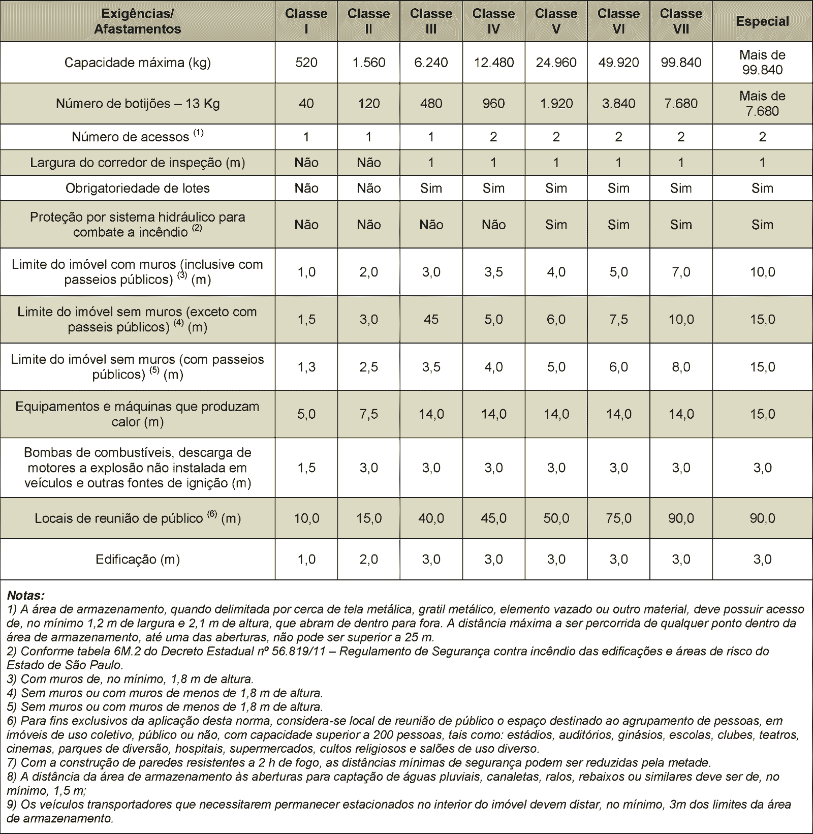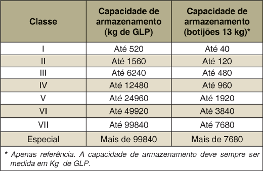5.2.1 As áreas de armazenamento de recipientes transportáveis são divididas em função da quantidade de GLP estocado, classificadas conforme Tabela 2, e requerem afastamentos de segurança e proteção específica, conforme Anexo A, de acordo com a NBR 15514, com adequações constantes nesta IT.