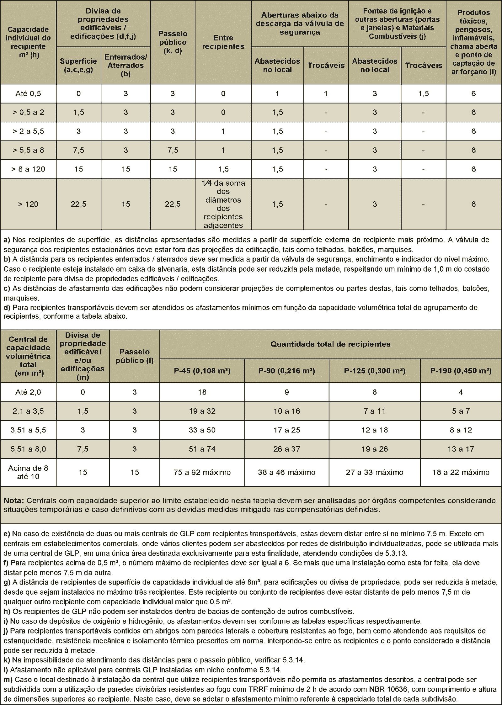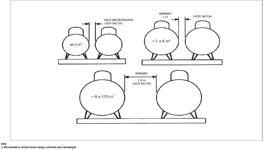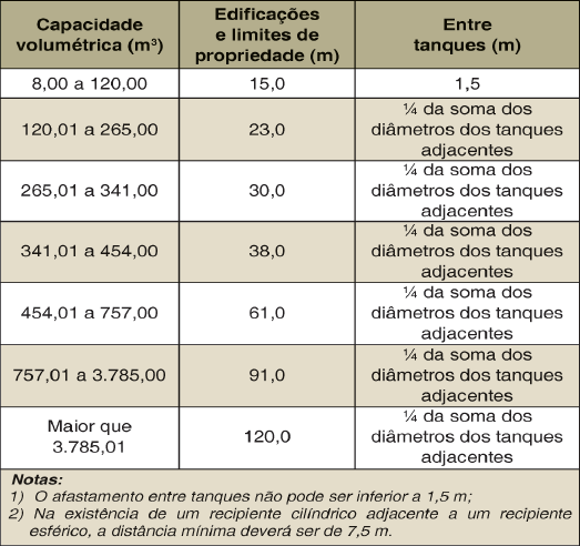 5.1.1.3 Recipientes estacionários com capacidade superior a 8 m³ devem manter o afastamento mínimo entre tanques, edificações e limites de propriedade conforme a Tabela 1.
