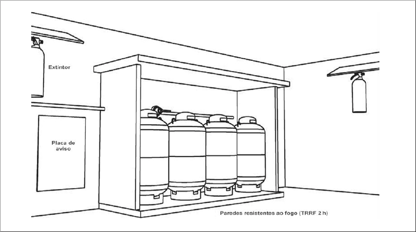 5.2.5 As instalações de armazenamento de recipientes transportáveis de GLP cheios, parcialmente utilizados ou vazios, devem exibir placas de advertências em lugares visíveis, sinalizando: “Perigo – Inflamável”, “Proibido o uso de fogo e de qualquer instrumento que produza faísca”.