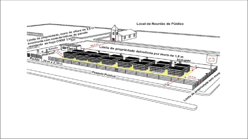 5.2.8.21.1 O afastamento entre as áreas de armazenamento deve ser o somatório das distâncias previstas para o limite do imóvel, constantes no Anexo A, para que sejam consideradas separadas;