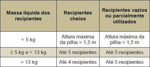 5.2.8.15 Recipientes de massa líquida superior a 13 kg devem obrigatoriamente ser armazenados na posição vertical e não podem ser empilhados.